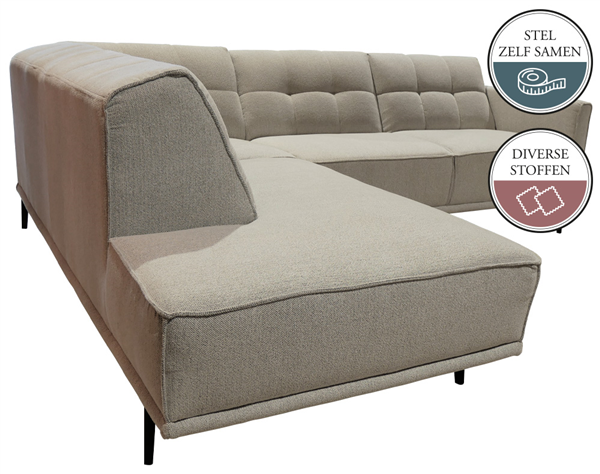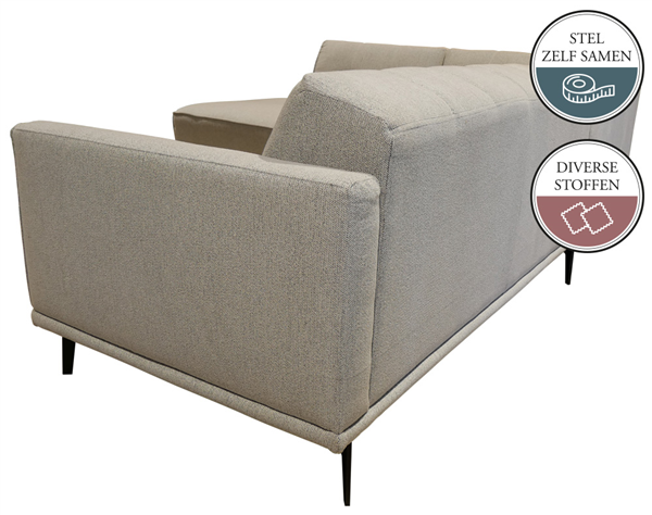 Dit zijn de onderdelen waarmee je je eigen bank samenstelt. Je combineert bijvoorbeeld een element met arm links met een ander element met arm rechts.