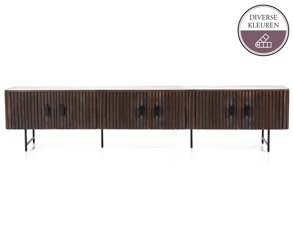 TV meubel EDMONTON is door zijn lamellenstructuur helemaal van deze tijd! Dit TV meubel is verkrijgbaar in bruin en zwart. De metalen pootjes en verfijnde handvaten geven dit vintage model toch een moderne uitstraling. Het TV meubel heeft 6 deurtjes, genoeg opbergruimte dus voor de spullen die je liever uit het zicht wil leggen. In de EDMONTON serie vind je ook een bijpassende kast, boekenkast, klein tv-meubel en dressoir.