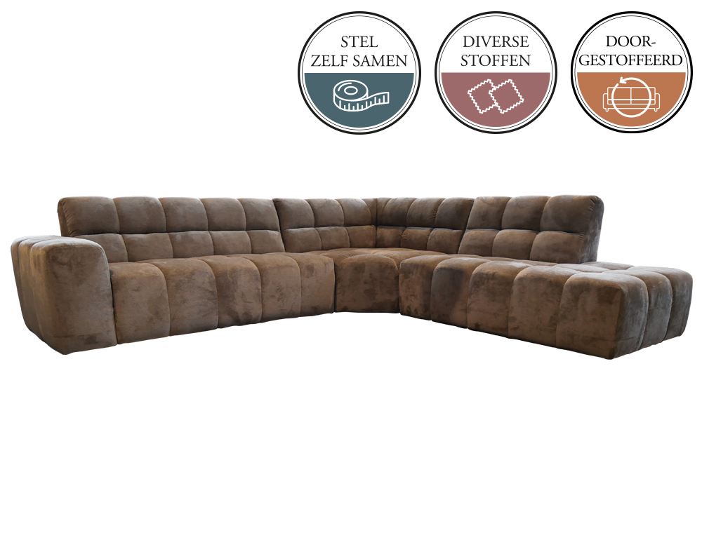 Dit zijn de onderdelen waarmee je je eigen bank samenstelt. Je combineert bijvoorbeeld een element met arm links met een ander element met arm rechts.