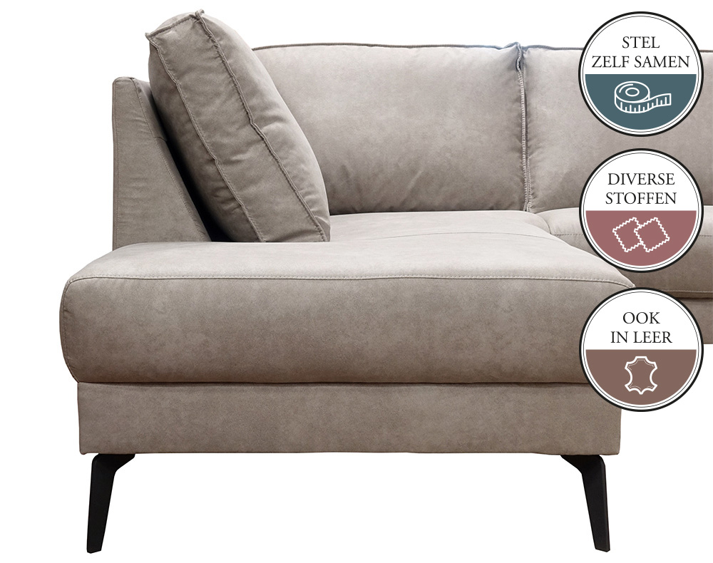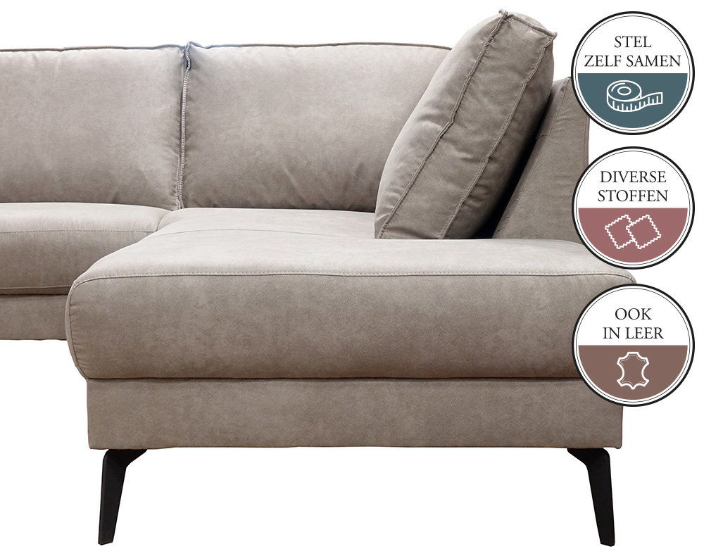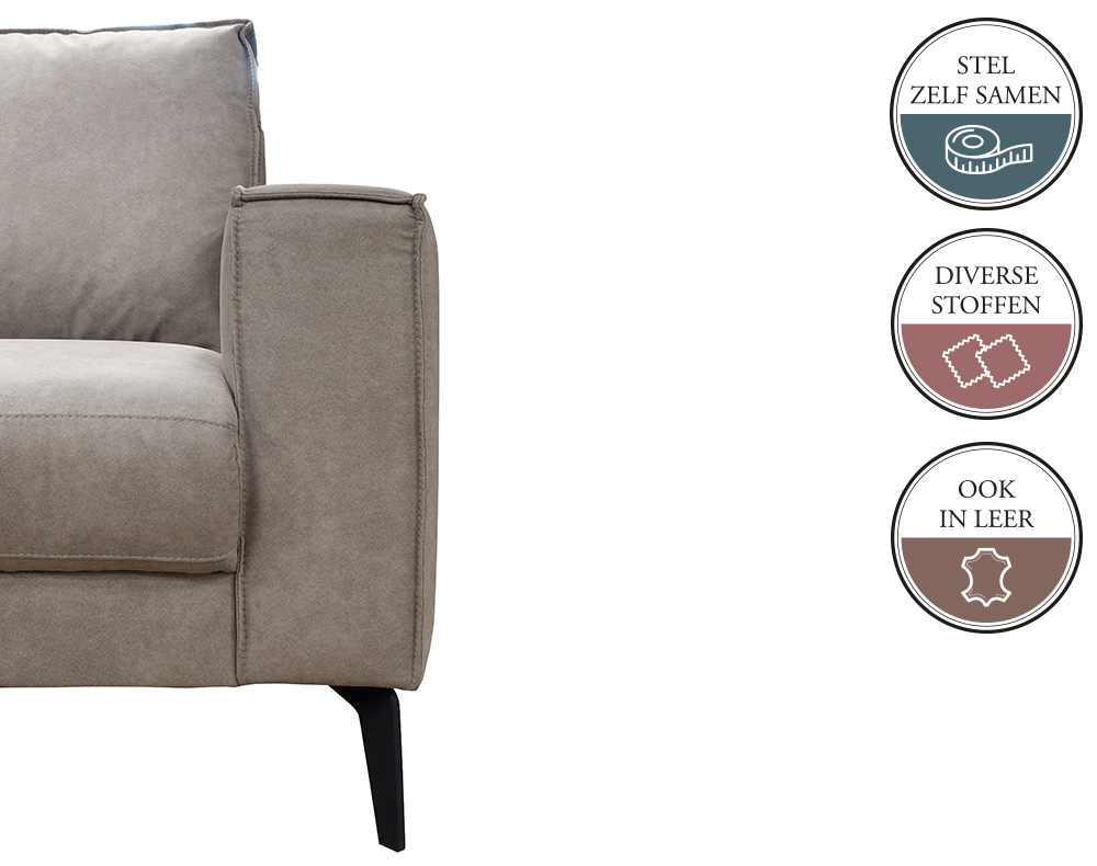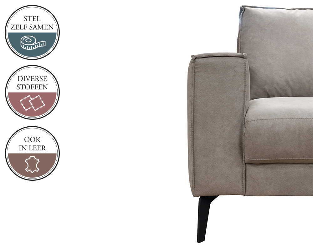 De bank JABIR is een elementenbank. Dat wil zeggen dat je deze bank helemaal naar eigen wens en smaak kunt samenstellen. Je stelt deze JABIR elementenbank zelf samen door de stappen in de configurator te volgen. Een elementenbank wordt altijd samengesteld (terwijl je ervoor staat) van links naar rechts.