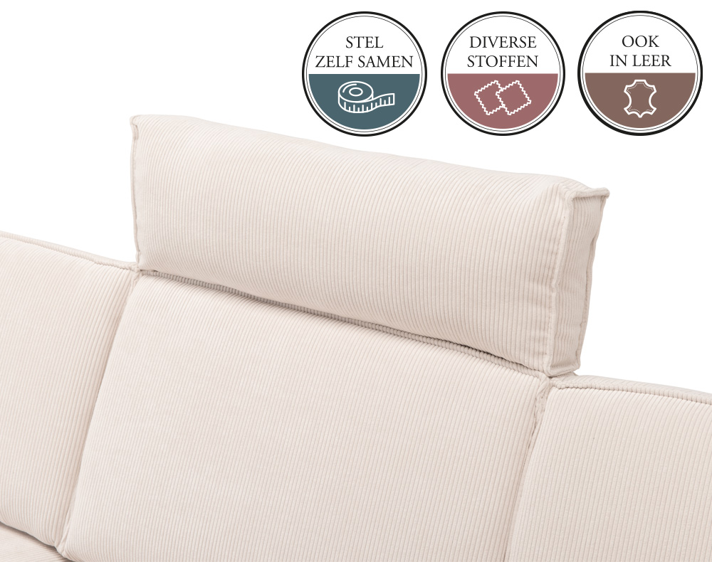 Extra opties: De JABIR hocker (poef) en de JABIR hoofdsteun (nekkussen) - in diverse uitvoeringen en afmetingen. Je kiest een nekkussen in dezelfde breedte als het element waarvoor je het gaat gebruiken. Advies: als je kiest voor een elektrisch deel, dan adviseren wij altijd als extra optie een hoofdsteun te kiezen.
