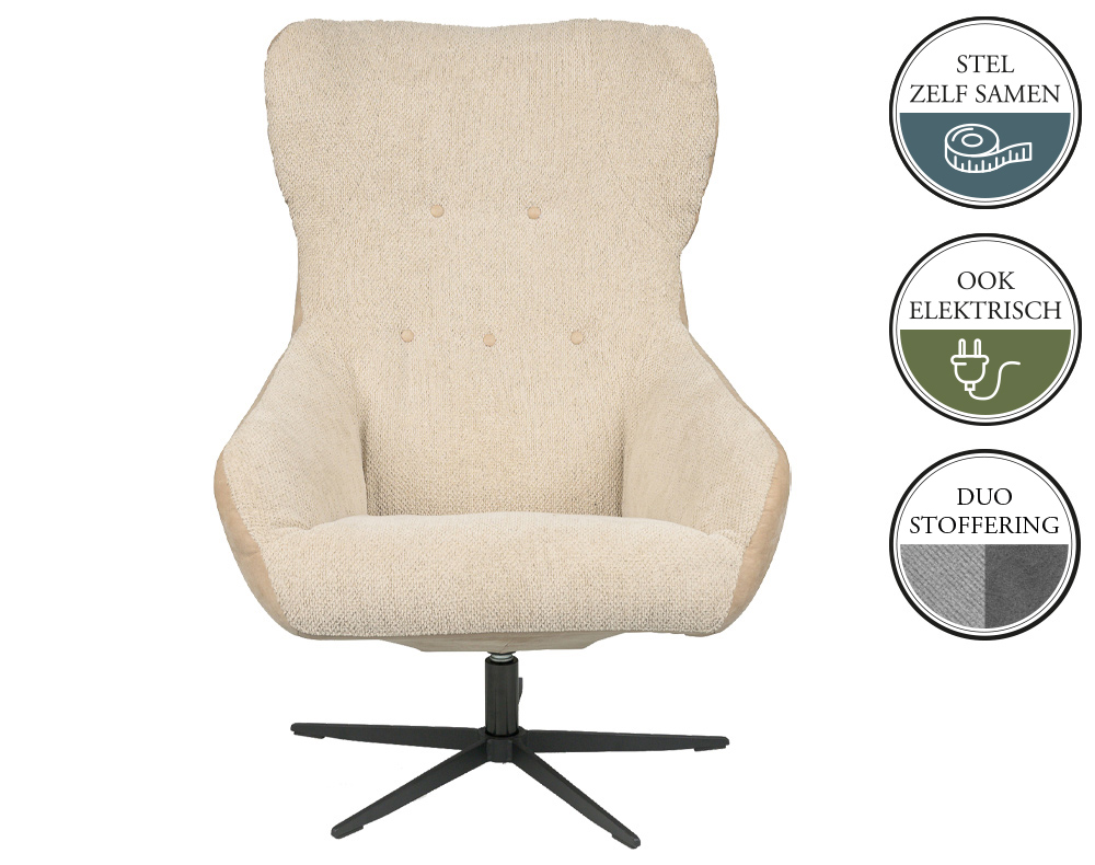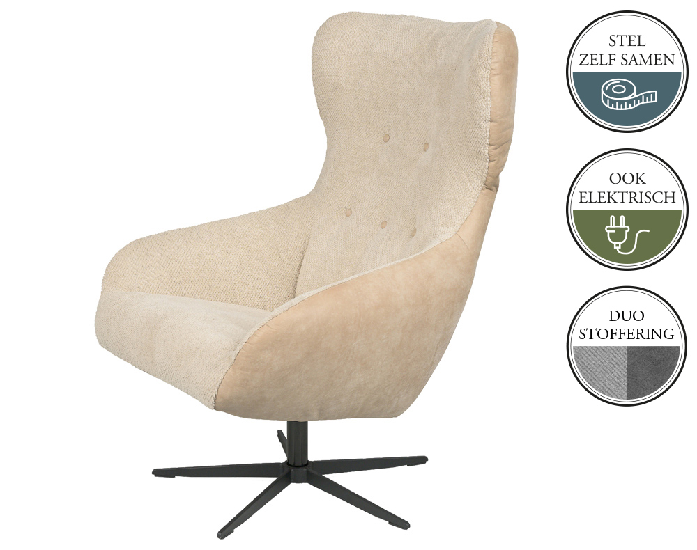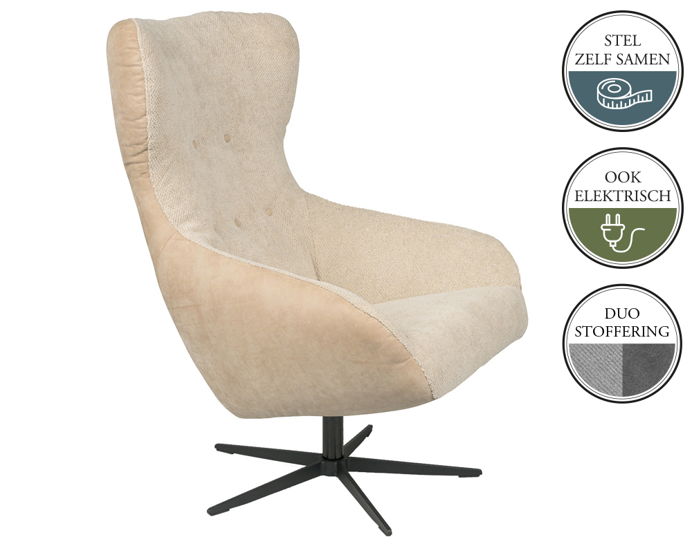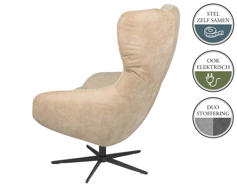 Fauteuil LYDIA: Je kunt bij deze fauteuil kiezen tussen een stof of leerkwaliteit op de binnenkant en een andere stof of leerkwaliteit op de buitenkant van de fauteuil. Als je kiest voor twee verschillende stoffen, leerkwaliteiten of kleuren, dan kies je bij de Stap Duo stoffering voor Ja. Er geldt een meerprijs voor duo stoffering. Wil je toch liever de fauteuil in één kleur, kies dan bij de stap duo stoffering voor nee. De hele fauteuil is dan in dezelfde stof, leerkwaliteit en kleur uitgevoerd.