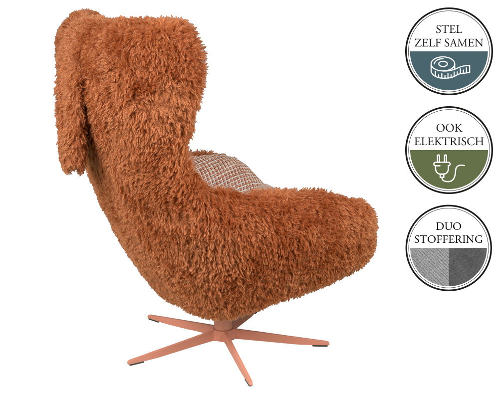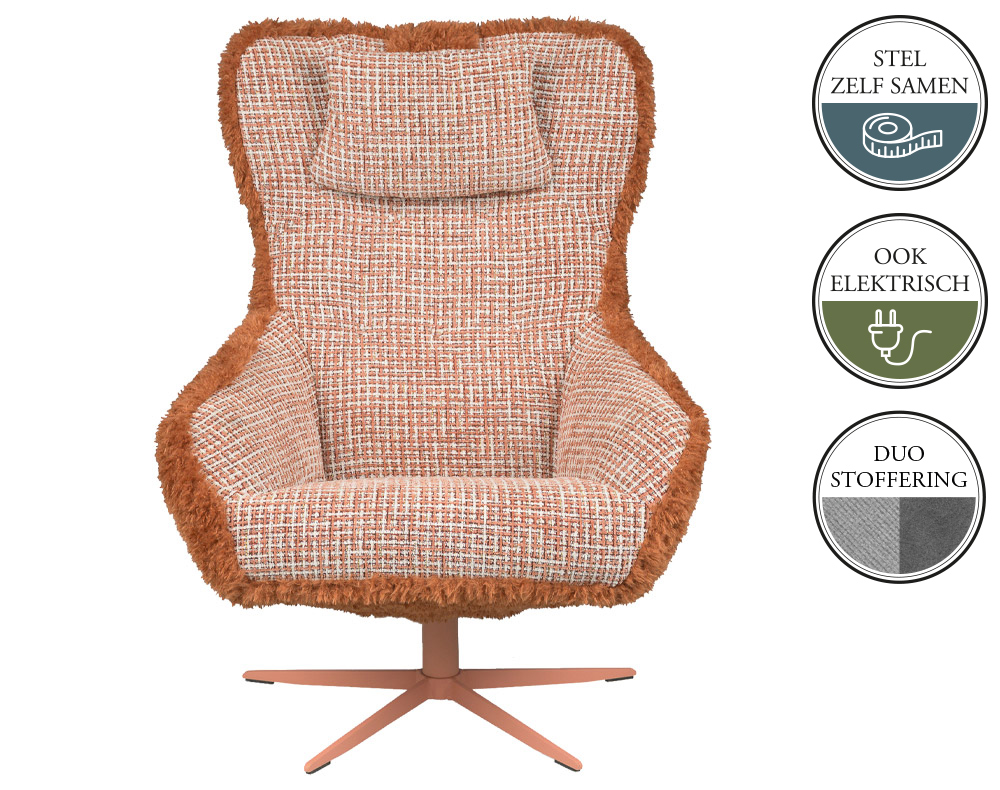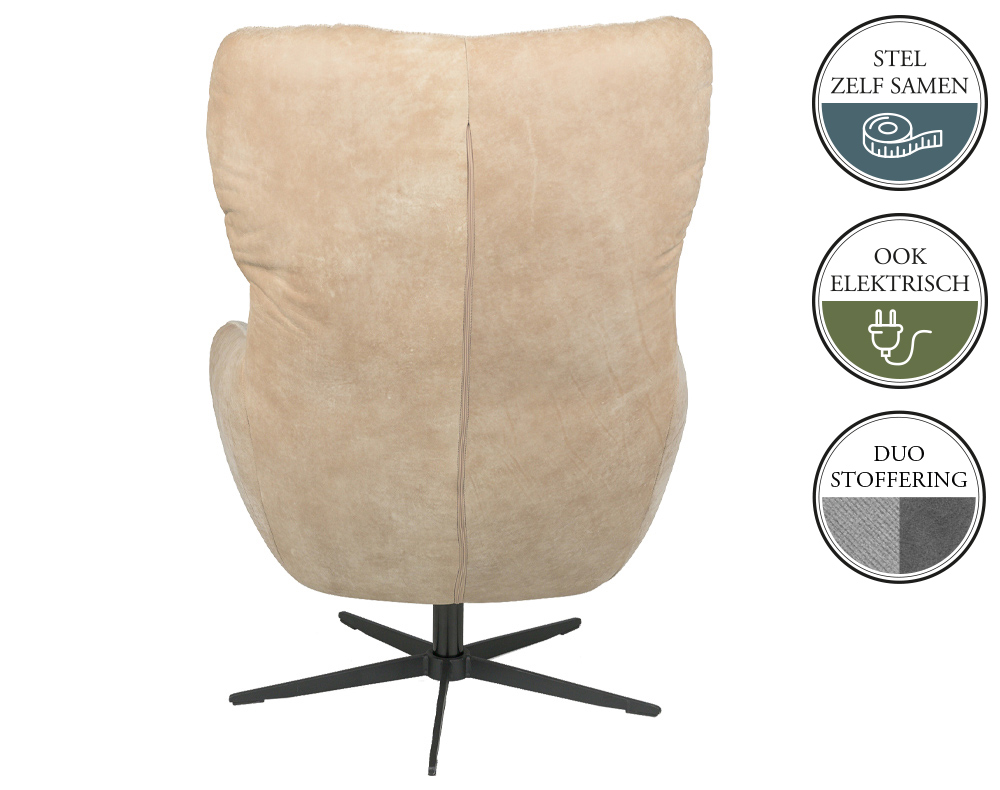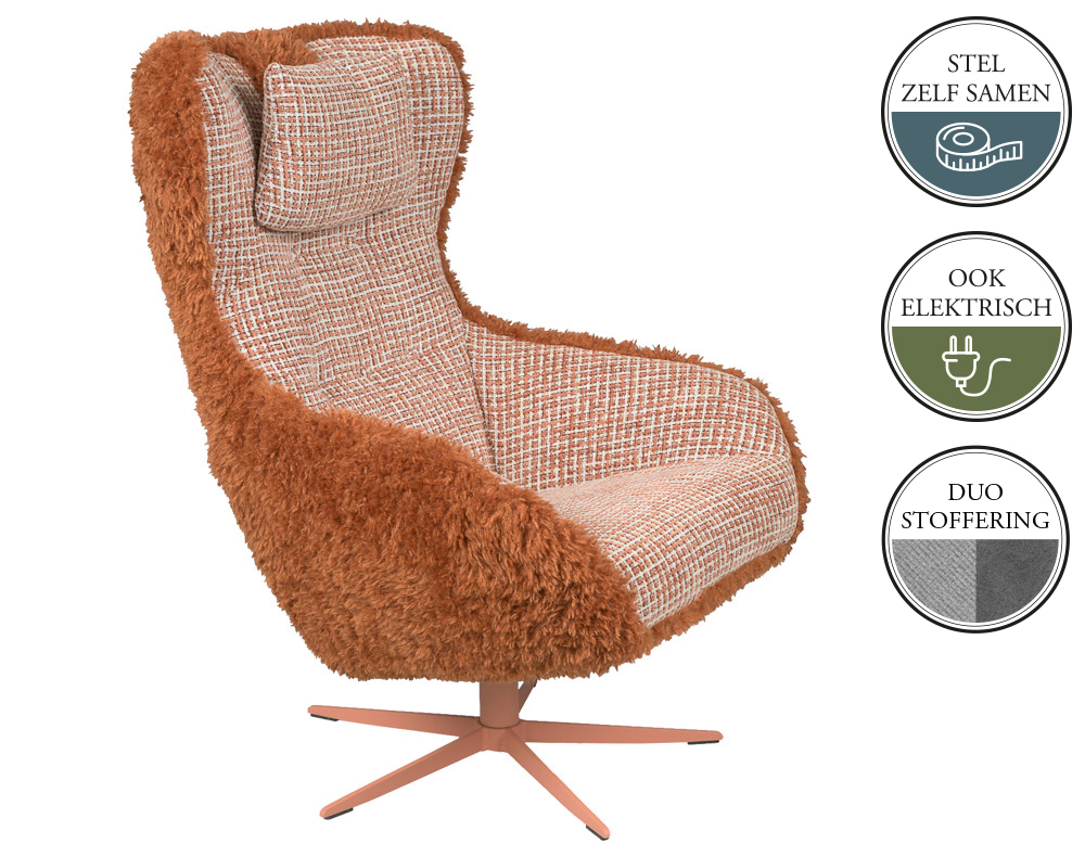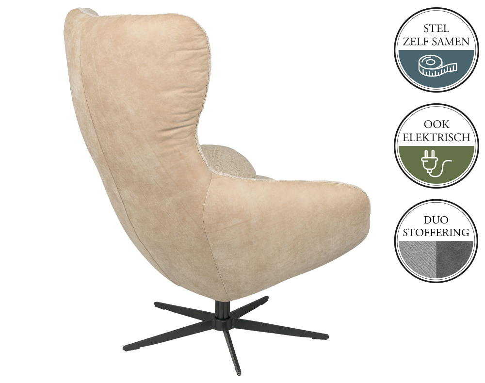 Fauteuil LYDIA: Je kunt bij deze fauteuil kiezen tussen een stof of leerkwaliteit op de binnenkant en een andere stof of leerkwaliteit op de buitenkant van de fauteuil. Als je kiest voor twee verschillende stoffen, leerkwaliteiten of kleuren, dan kies je bij de Stap Duo stoffering voor Ja. Er geldt een meerprijs voor duo stoffering. Wil je toch liever de fauteuil in één kleur, kies dan bij de stap duo stoffering voor nee. De hele fauteuil is dan in dezelfde stof, leerkwaliteit en kleur uitgevoerd.