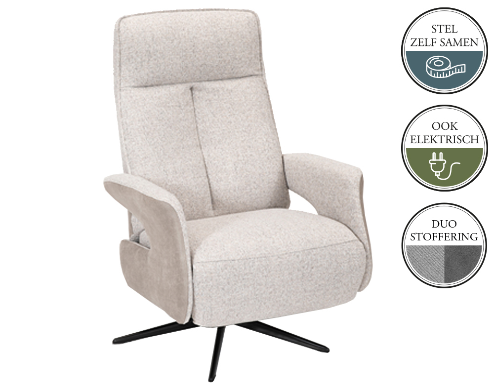 Wil je toch liever de fauteuil in één kleur, kies dan bij de stap duo stoffering voor nee. De hele fauteuil is dan in dezelfde stof, leerkwaliteit en kleur uitgevoerd.