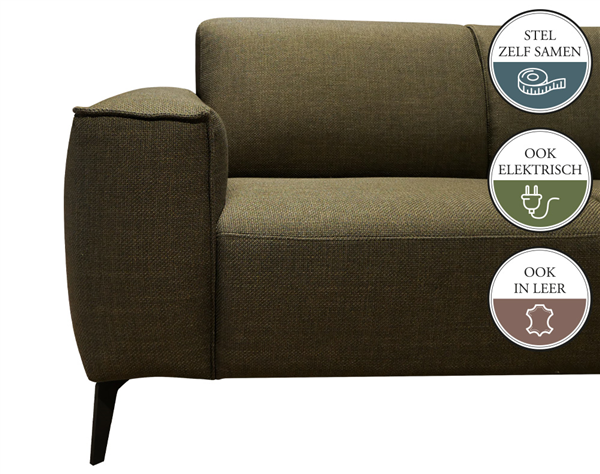 Deze combinatie staat in onze winkels. Zoals je aan de opsomming onder het icoontje ziet begin je de bank samen te stellen door een arm links te kiezen. Daarna kies je je element(en).