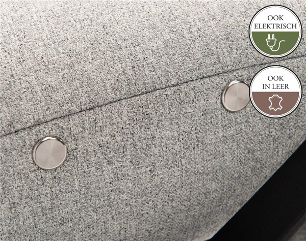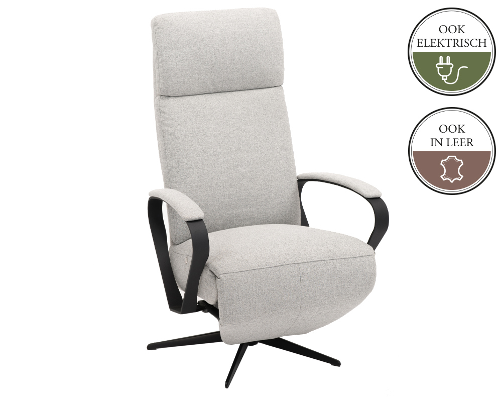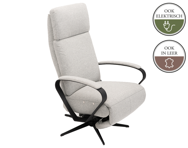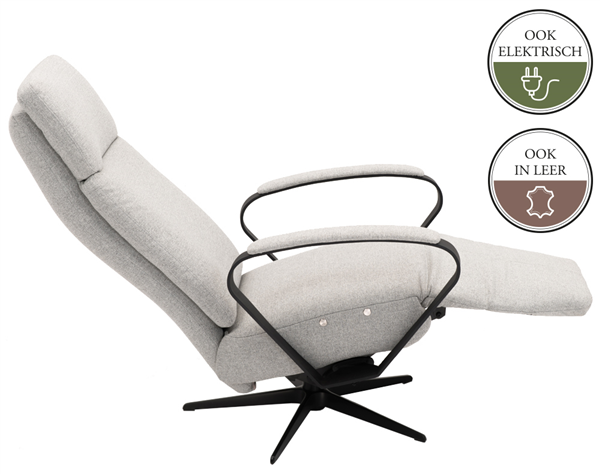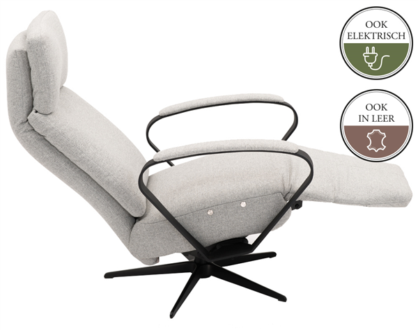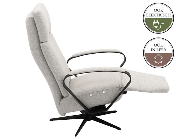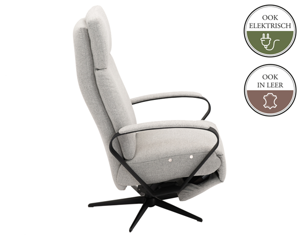 Deze relaxfauteuil is zowel manueel als elektrisch verstelbaar mogelijk. Mocht je voor de elektrische variant kiezen dan er een accu leverbaar. Als je een accu bestelt, dan wordt de fauteuil niet uitgevoerd met een snoer.