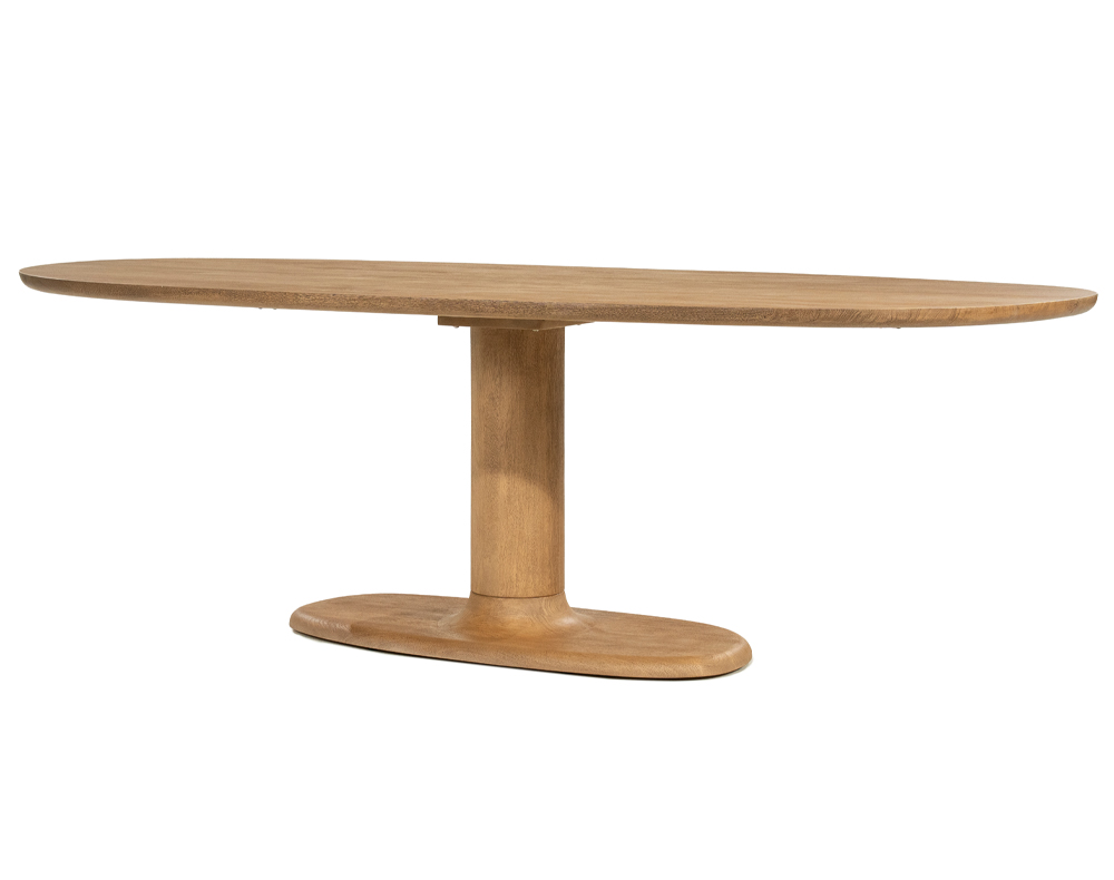 Prachtige tafel ROOF met kolom poot. De ROOF tafel is zowel rond - 130 cm - als in Deens Ovaal -180, 240 of 300 cm - te verkrijgen. De tafel is gemaakt van geborsteld Mango hout en leverbaar in 2 kleuren, licht bruin en naturel. De dikte van het tafelblad is 3,8 cm.