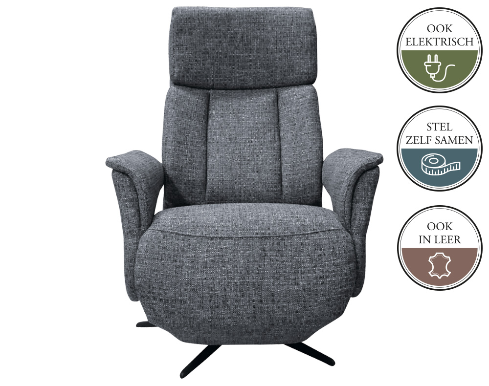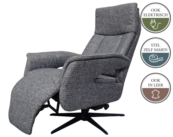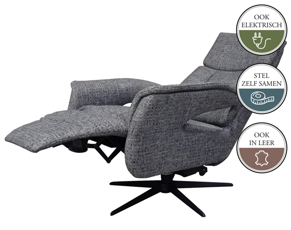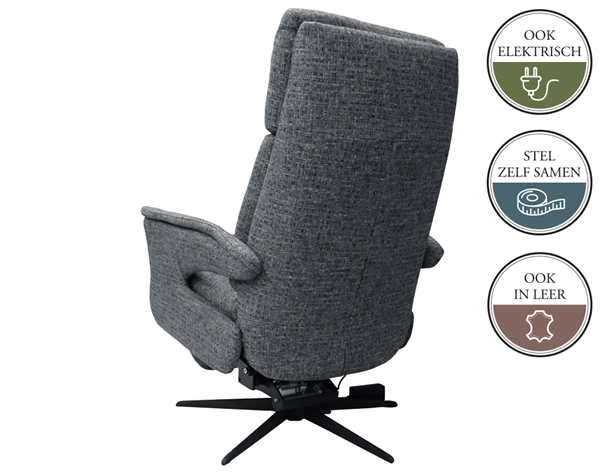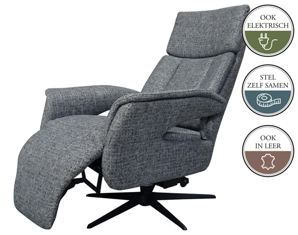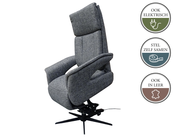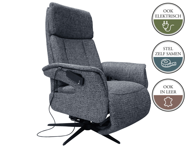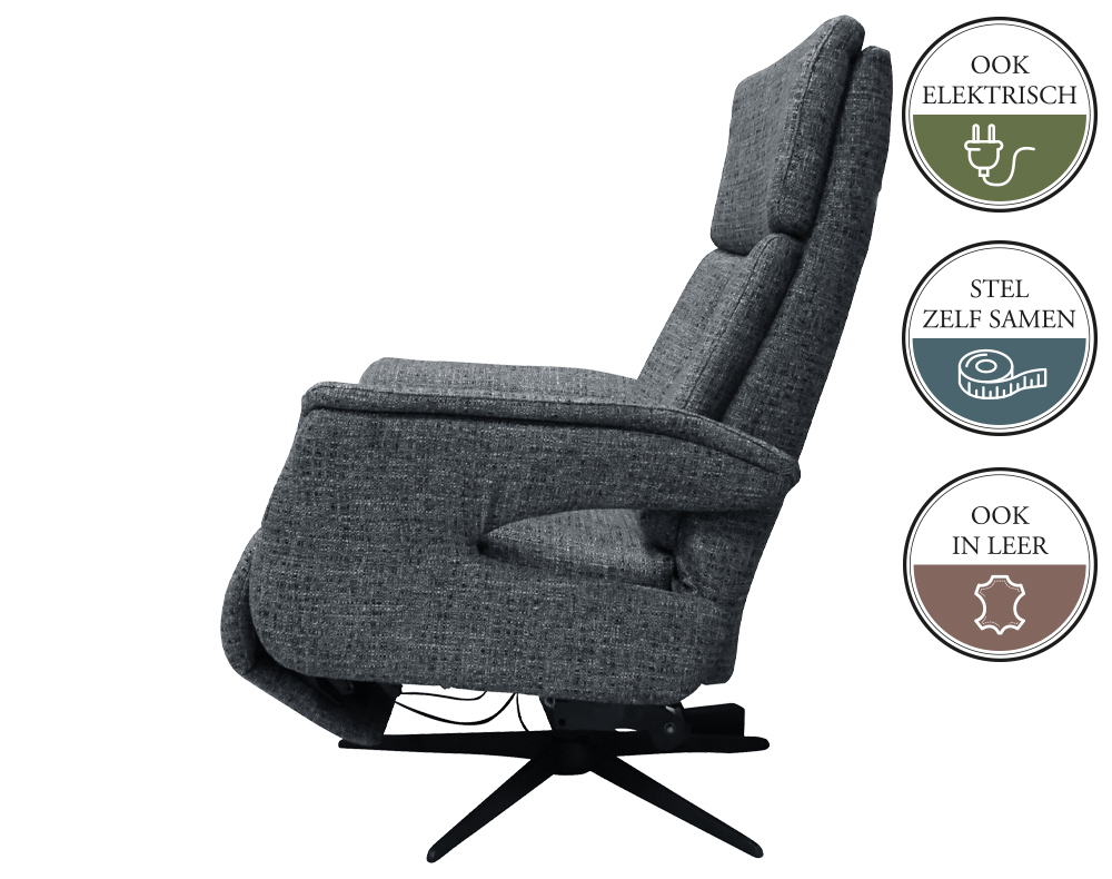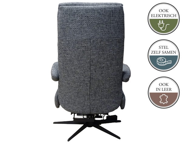 Deze relaxfauteuil is zowel manueel als elektrisch verstelbaar mogelijk. Mocht je voor de elektrische variant kiezen dan er een accu leverbaar. Als je een accu bestelt, dan wordt de fauteuil niet uitgevoerd met een snoer.