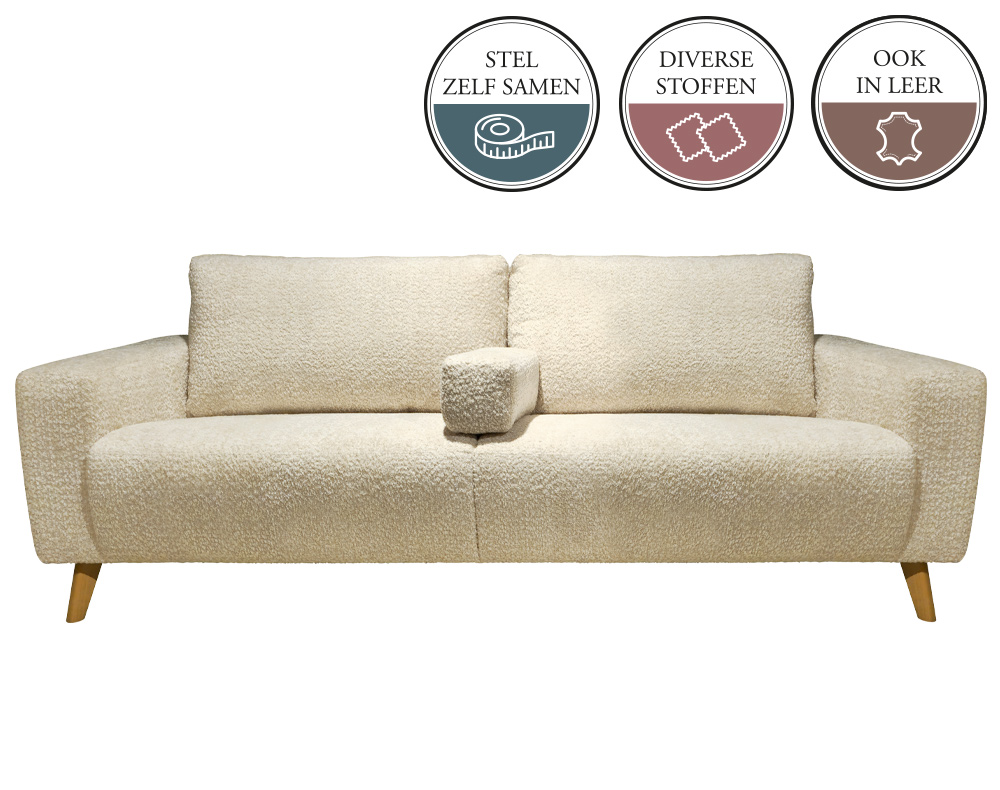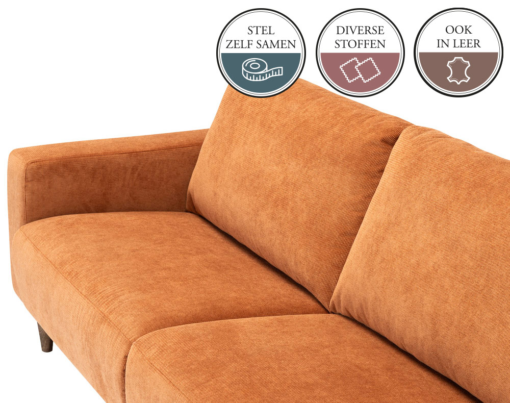 Elementenbank SVEN in de Japandi stijl. Door de losse rugkussens krijgt deze gezellige bank een hele zachte en uitnodigende uitstraling. Er is een ruime keuze uit vele stofsoorten en microleer of leder in een groot aantal kleuren.