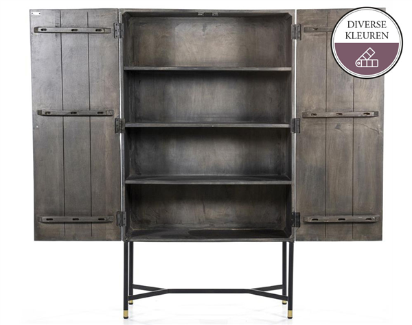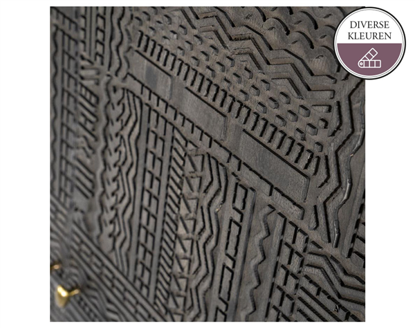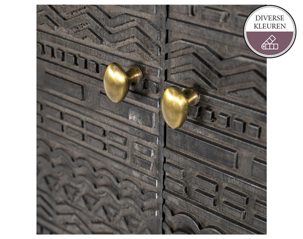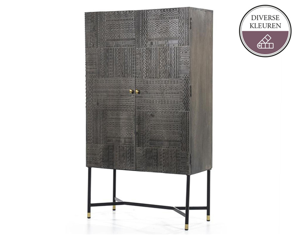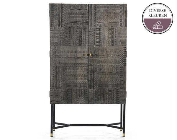 Deze mooie kabinetkast TABORA is gemaakt van mango hout en staat op een metalen onderstel. De kast is voorzien van een prachtig houtsnijwerk, wat de kast een unieke uitstraling geeft. Verkrijgbaar in donkerbruin en donkergrijs. Voor welke kleur ga jij?